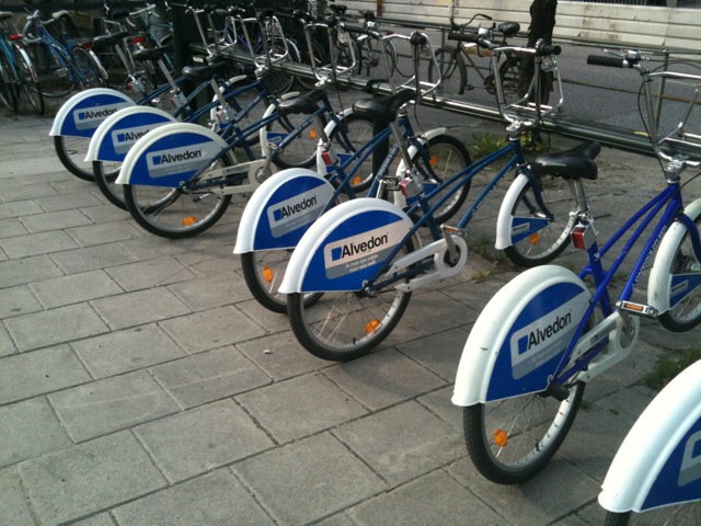 Jag invigde när jag slutade jobba idag. Precis utanför mitt jobb finns det ett ställ med massor av Alvedoncyklar. Jag lägger mitt lilla plastkort mot en avläsare och avläsaren säger åt mig vilken cykel jag får ta. Jag hakar av den ur cykelstället och hojjar iväg.