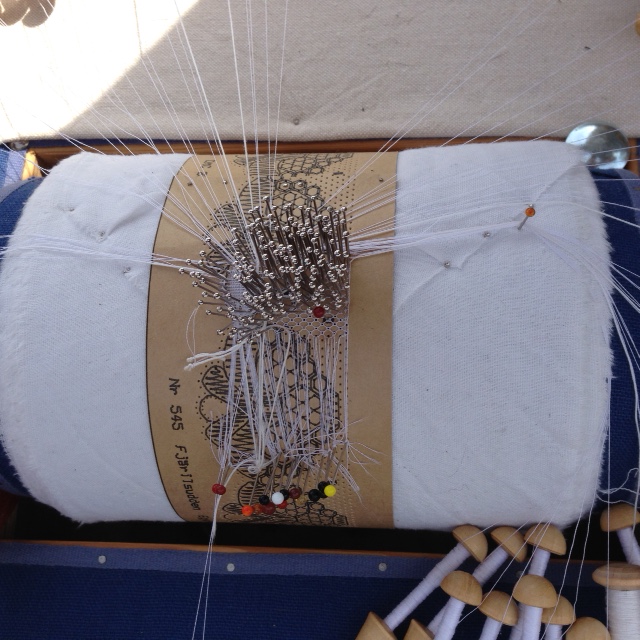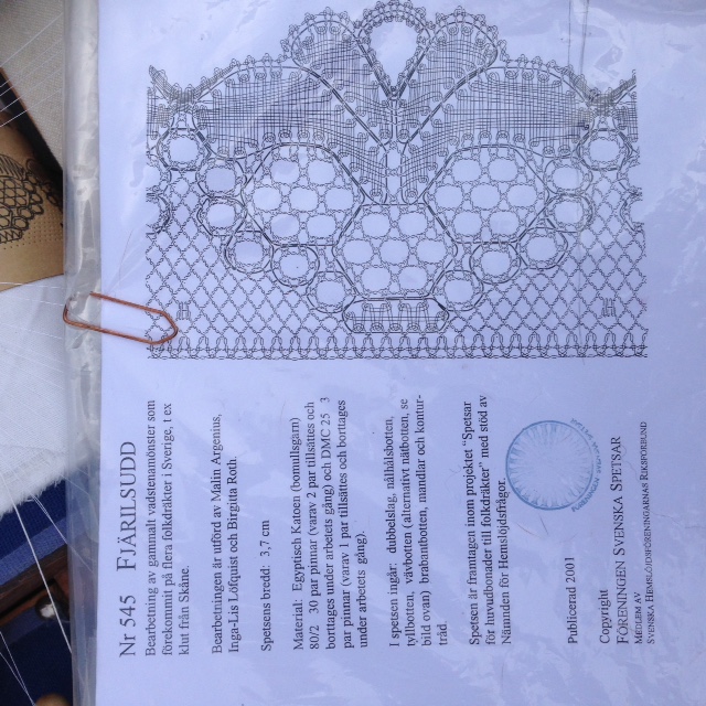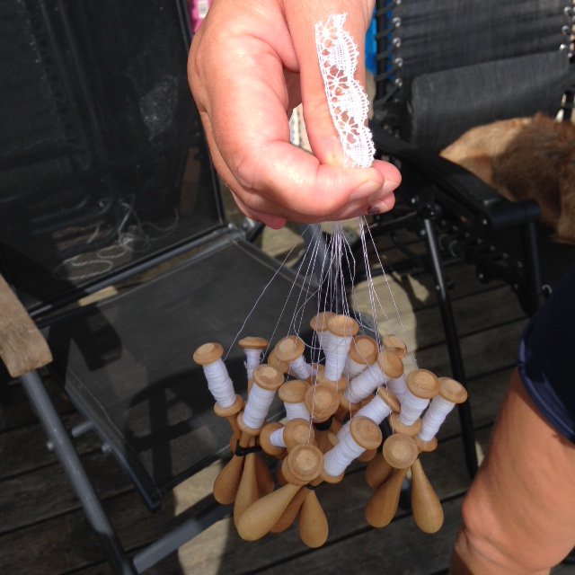 Så galet komplicerat. Kvinnogöra som troligtvis härsammar från tidigt 1500-tal. Du behöver vara hyfsat begåvad inuti ditt huvud. Du behöver kunna koncentrera dig. Du behöver framför allt inte ha bråttom och ont om tid. Då blir du tokig. Troligtvis behöver du vara pensionär också. Utan andra fritidssysselsättningar. Detta är inte ett nutidsämne. Men det kanske skulle kunna fungera som terapi och dessutom vara rätt billigt i förhållande till terapeutpriserna på stan. Kanske behövdes det inte så många terapeuter förr. Kanske är detta just precis vad en bråttommänniska skulle behöva. Knyppla spetsar att sätta på dukar. Som också var handvävda då förstås.