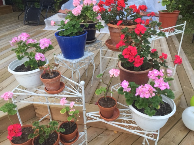 Pelargonerna är så andlöst vackra att jag ofta blir stående och bara tittar. Har i sommar byggt en veranda i trädgården utanför röda huset där alla blommorna bor nu. Det blev så fint. Känner mig så bortskämd av livet. När det stormar och blåser står jag just nu stadigt på jorden, vattnar mina blommor och är tacksam över att det basala i livet som mat, boende, jobb är hyfsat stabilt. Men livet är ju en ständigt föränderlig process så det är bara att förhålla sig till att allt kommer och går. Men det som är bra är att även saker som PMS och klimakterier försvinner. Man får hålla i hatten och vara tacksam för det. Nu är det slut på att vakna mitt i natten och vilja gå ut och rulla sig i snön. Och lustigt är det. För när man väl är mitt inne i en vallning eller varför inte ett eländigt PMS förstår man inte hur det känns att vara glad och fräsch. Men när eländet väl är över glömmer man hur trist man kände sig mitt i. Minnet är kort. Tack och lov!