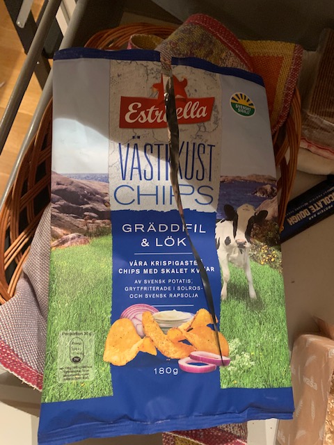 Så, nu har jag köpt en alldeles ny fin påse av samma sorts svenska chips och lagt den i brödlådan tills du kommer igen. Den är oöppnad och det gör att jag inte hör de små söta chipsen när de sjunger komsi, komsi. Och därför behöver jag inte äta dem och kan ta min havreknäckemacka med smör och ost istället. Alldeles svenska såklart!